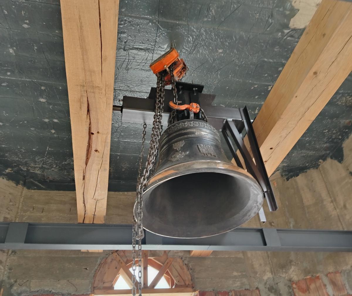 La 20 august 2025, dl Constantinescu Florin de la firma Transport Costrans a făcut un act de binefacere și a ridicat cu macaraua cele 2 grinzi de stejar pregătite pentru ansamblu de prindere și clopotul recent adus, iar 2 zile mai târziu a venit echipa de montaj de la firma Premium Bells, constituită din Mazur Adrian și Mileac Mihail.